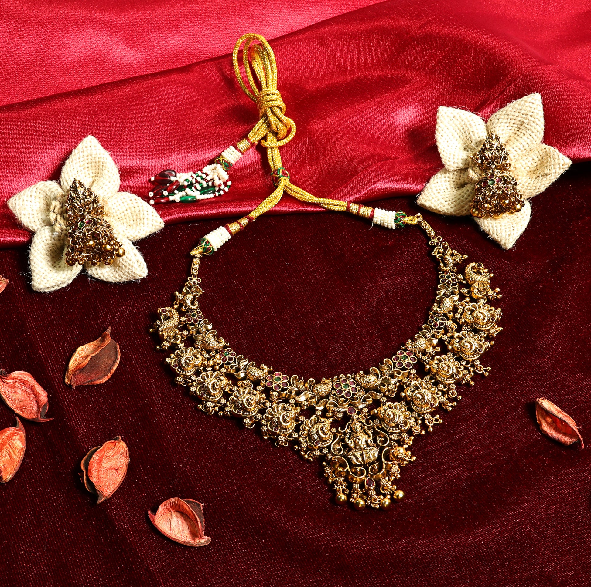 This elegant antique finish necklace showcases delicate floral engravings with a central deity pendant. Highlighted with red and green stones, it makes a graceful addition to traditional attire.