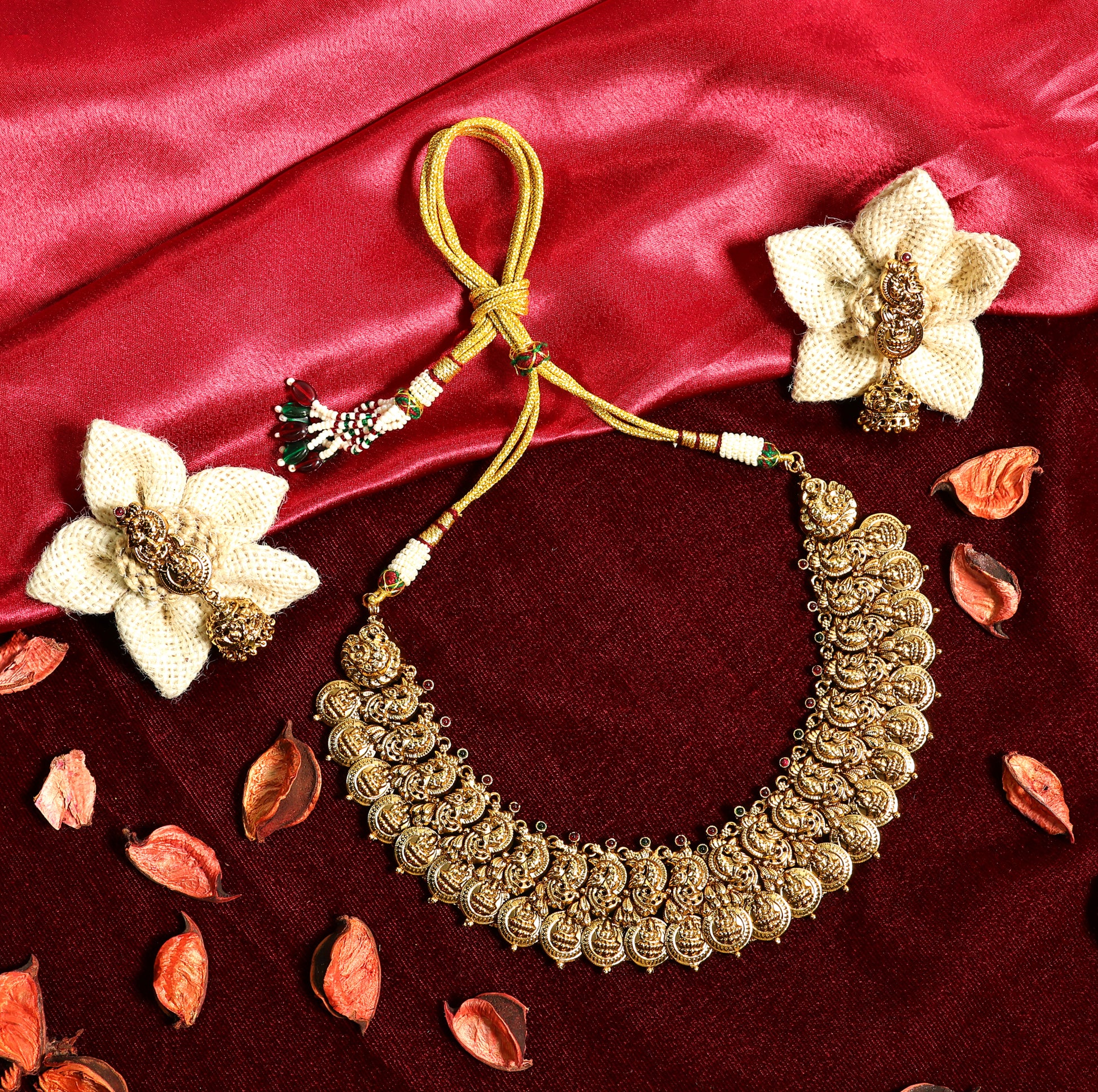 Showcasing embossed Lakshmi coins strung together with intricate artistry, this necklace embodies prosperity and tradition. Its antique polish and detailed craftsmanship make it a timeless piece for brides and traditional wearers.
