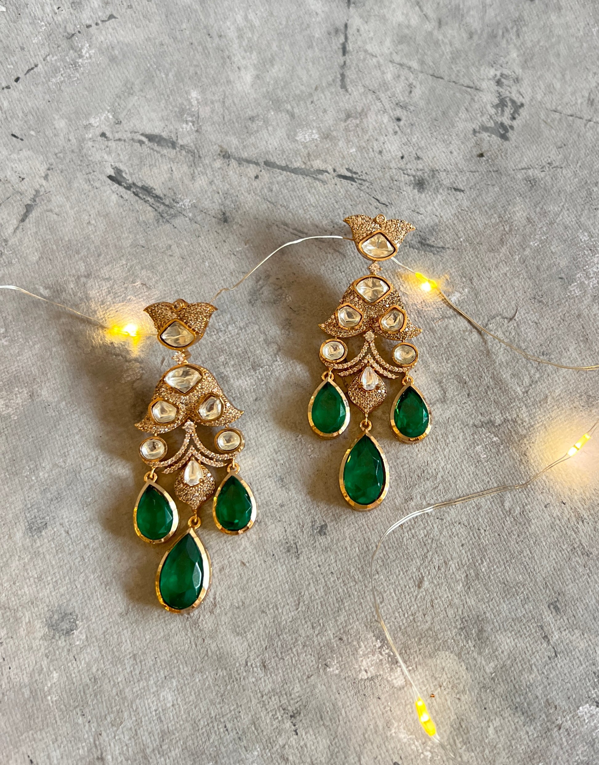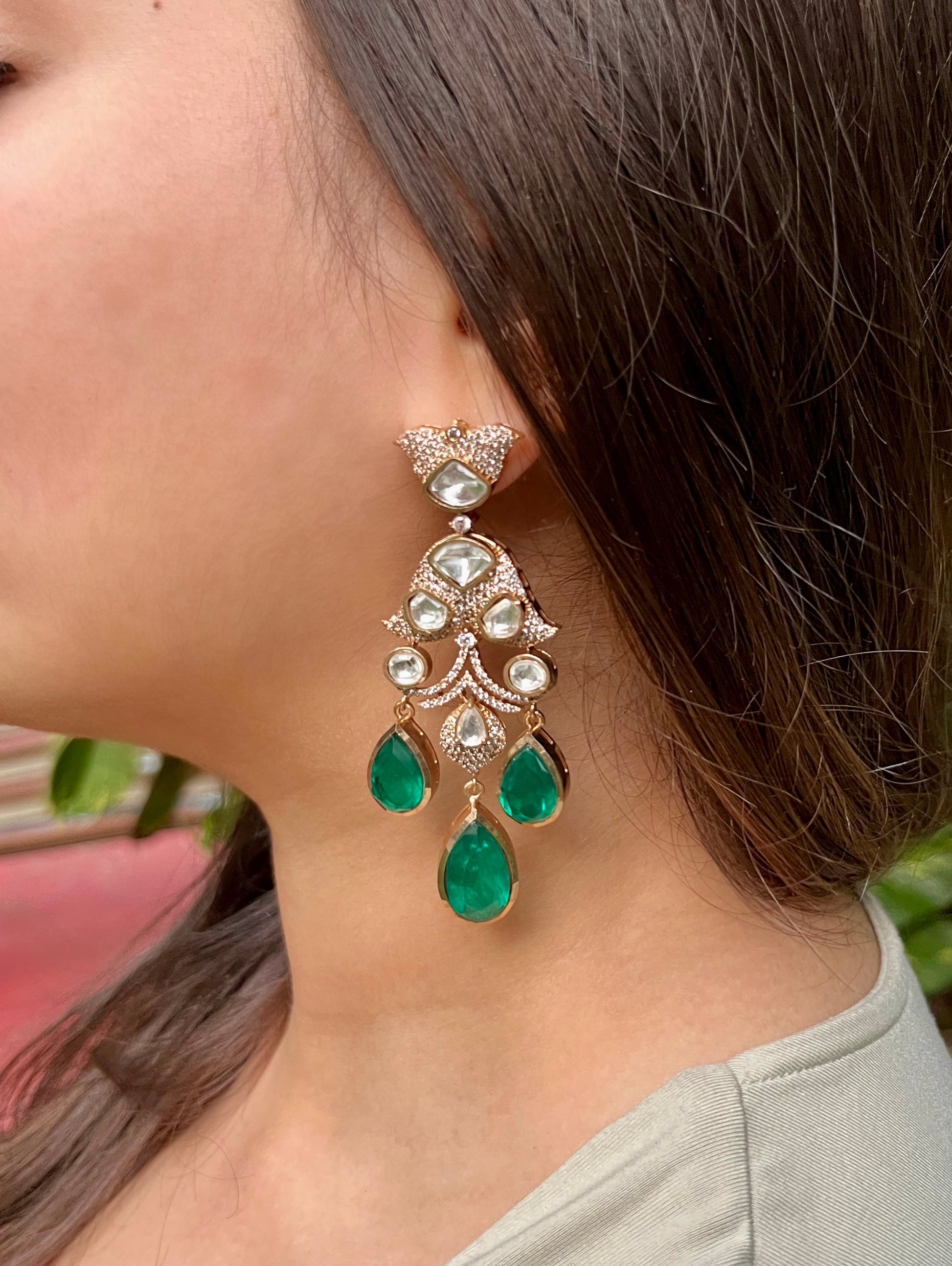 These earrings are a striking blend of grandeur and craftsmanship, featuring a regal arrangement of uncut crystals and shimmering accents. Suspended from a textured, diamond-studded triangular stud, the cascading framework is adorned with luminous polki-style stones, framed by delicate pavé detailing. The pièce de résistance is the trio of faceted emerald-green teardrop gemstones, their vivid hues adding a captivating contrast.