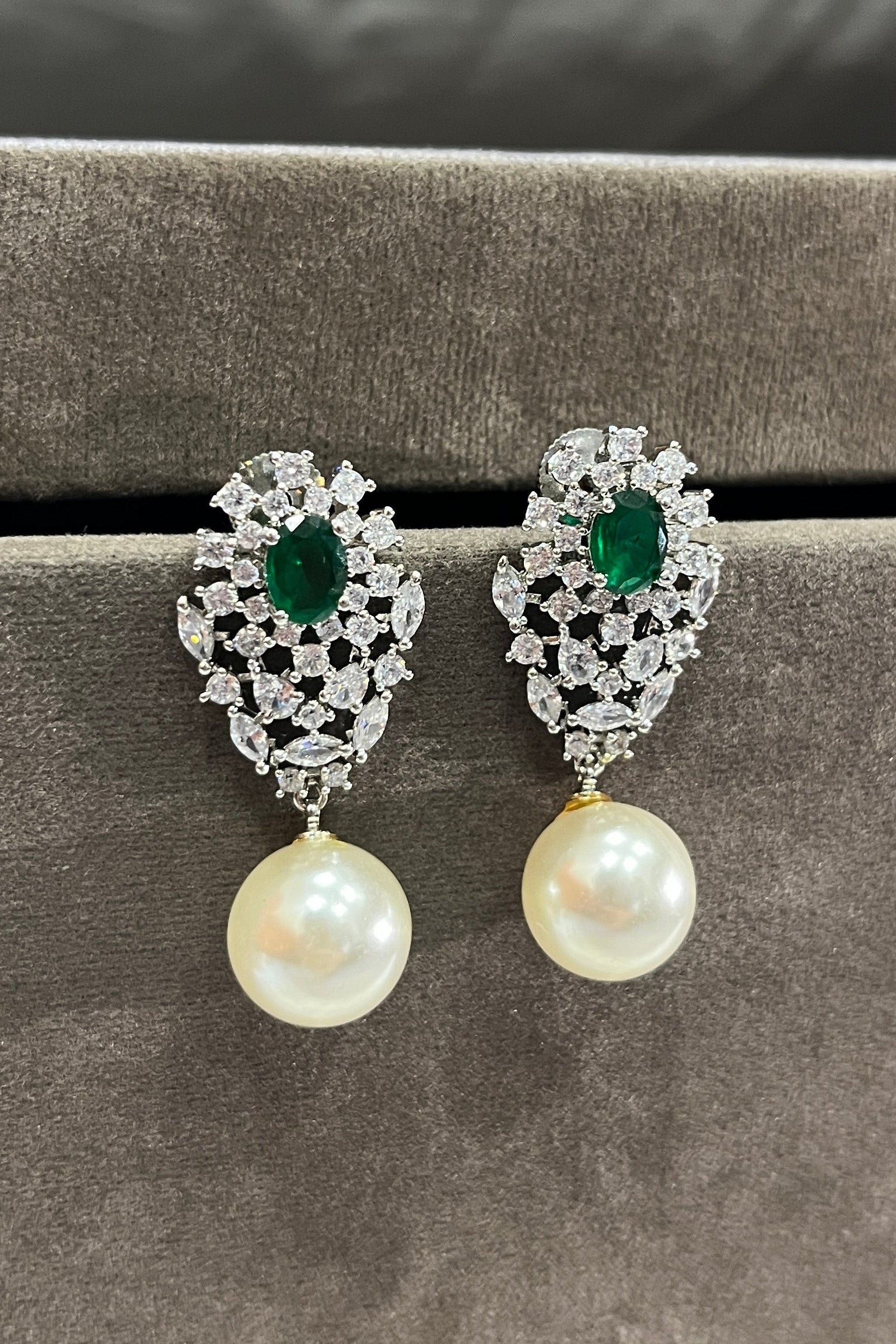 These vintage-inspired earrings feature emerald-toned zircon tops paired with lustrous pearl drops. The white finish enhances their graceful charm, ideal for elegant evenings and festive celebrations.