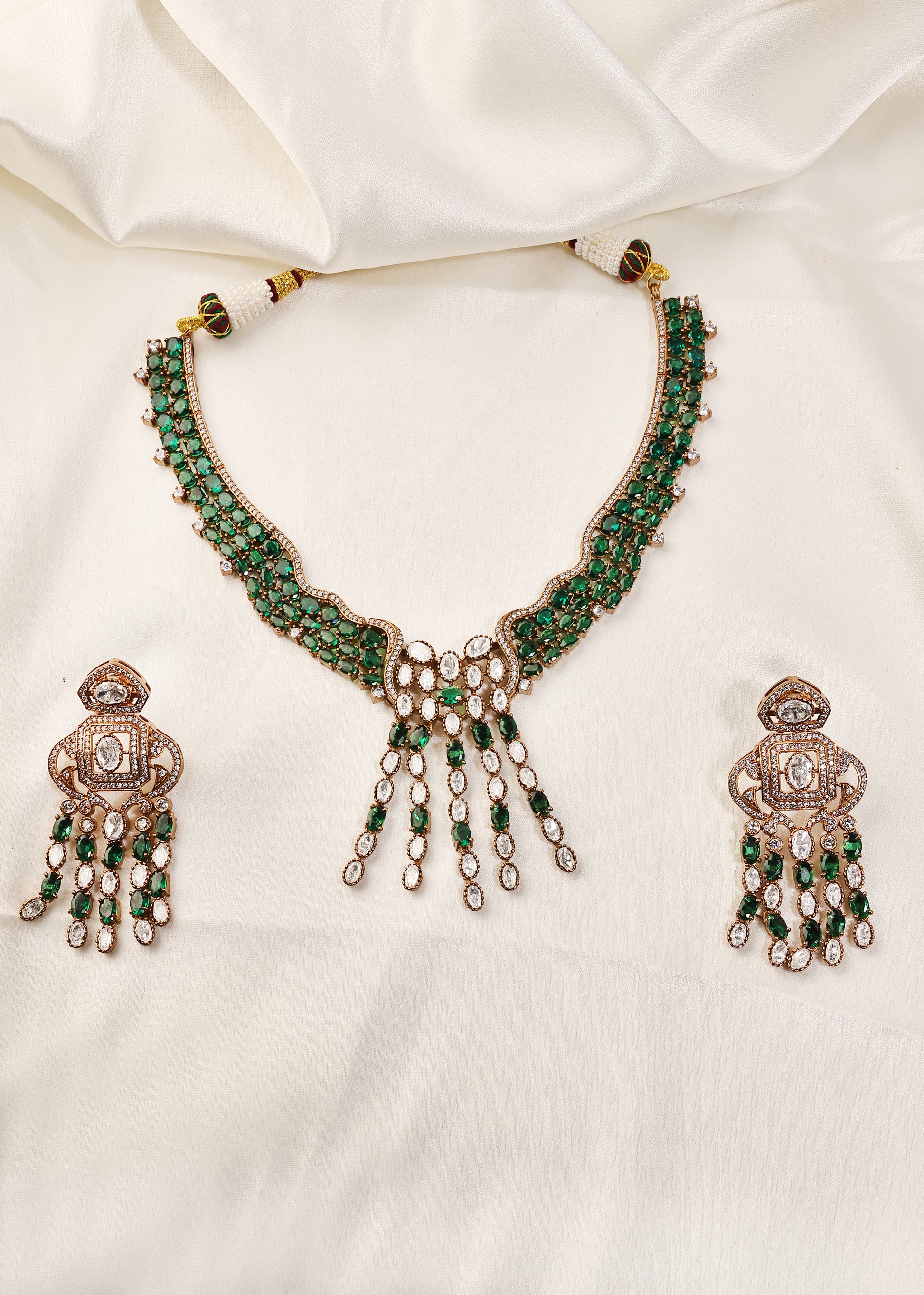 An emerald-cluster necklace set designed with Zircon highlights and cascading drops for an opulent cocktail look.
