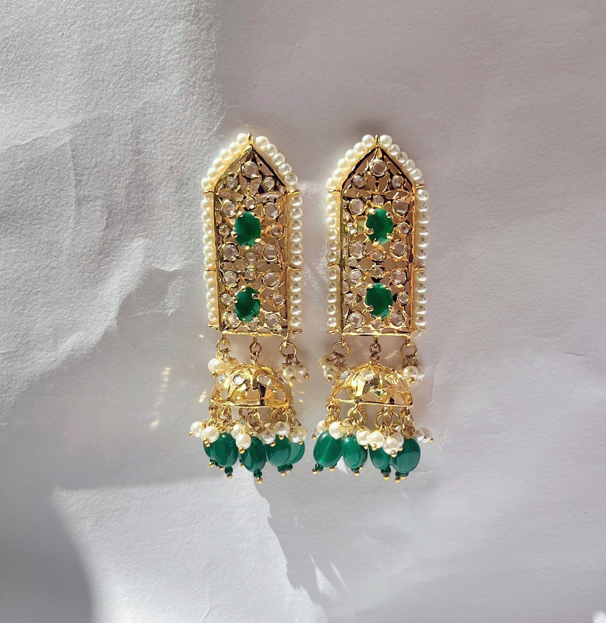 These Hyderabadi Crystal Kundan Earrings are a true masterpiece of craftsmanship. With delicate pearls and sparkling green beads, they exude elegance and sophistication. Adorn yourself with these earrings and radiate a regal charm that will leave everyone in awe. Elevate your style with this luxurious piece of jewelry.