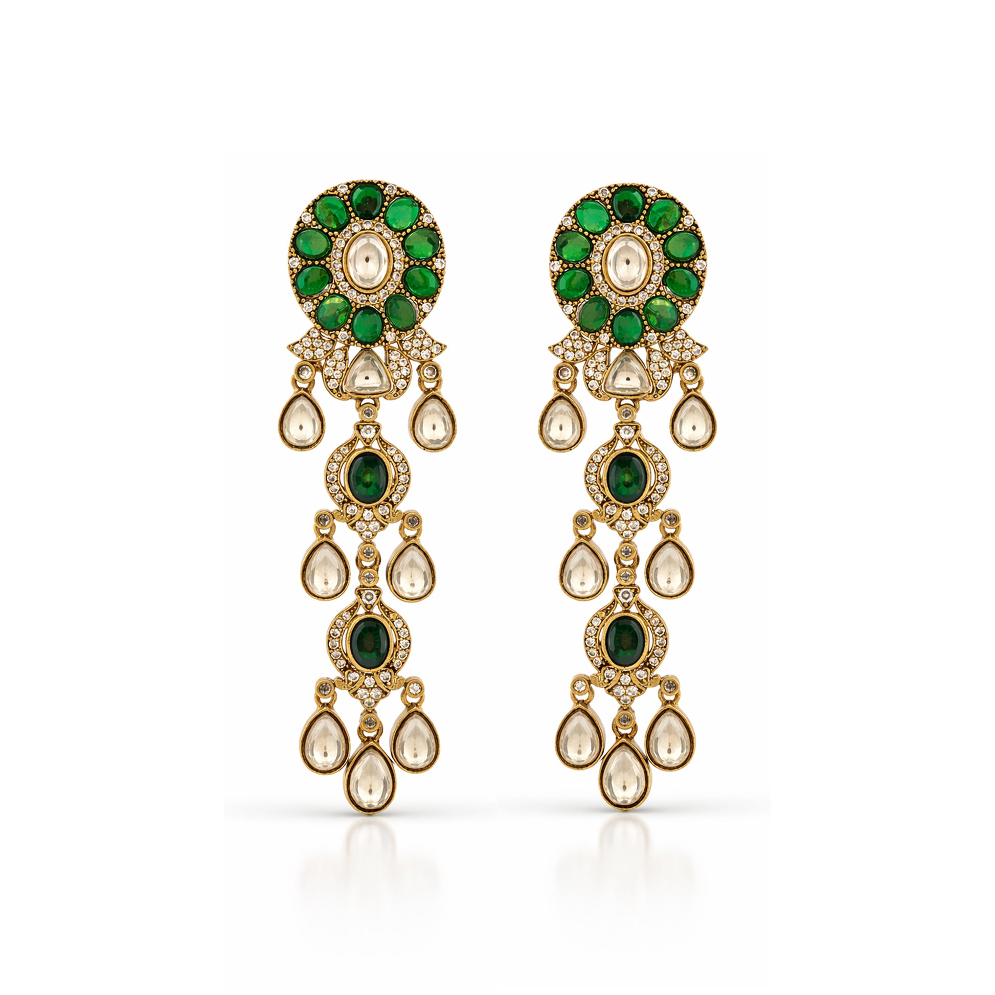 Oval emerald stones cascade through delicate Polki drops, forming a regal vertical design that radiates royal sophistication.