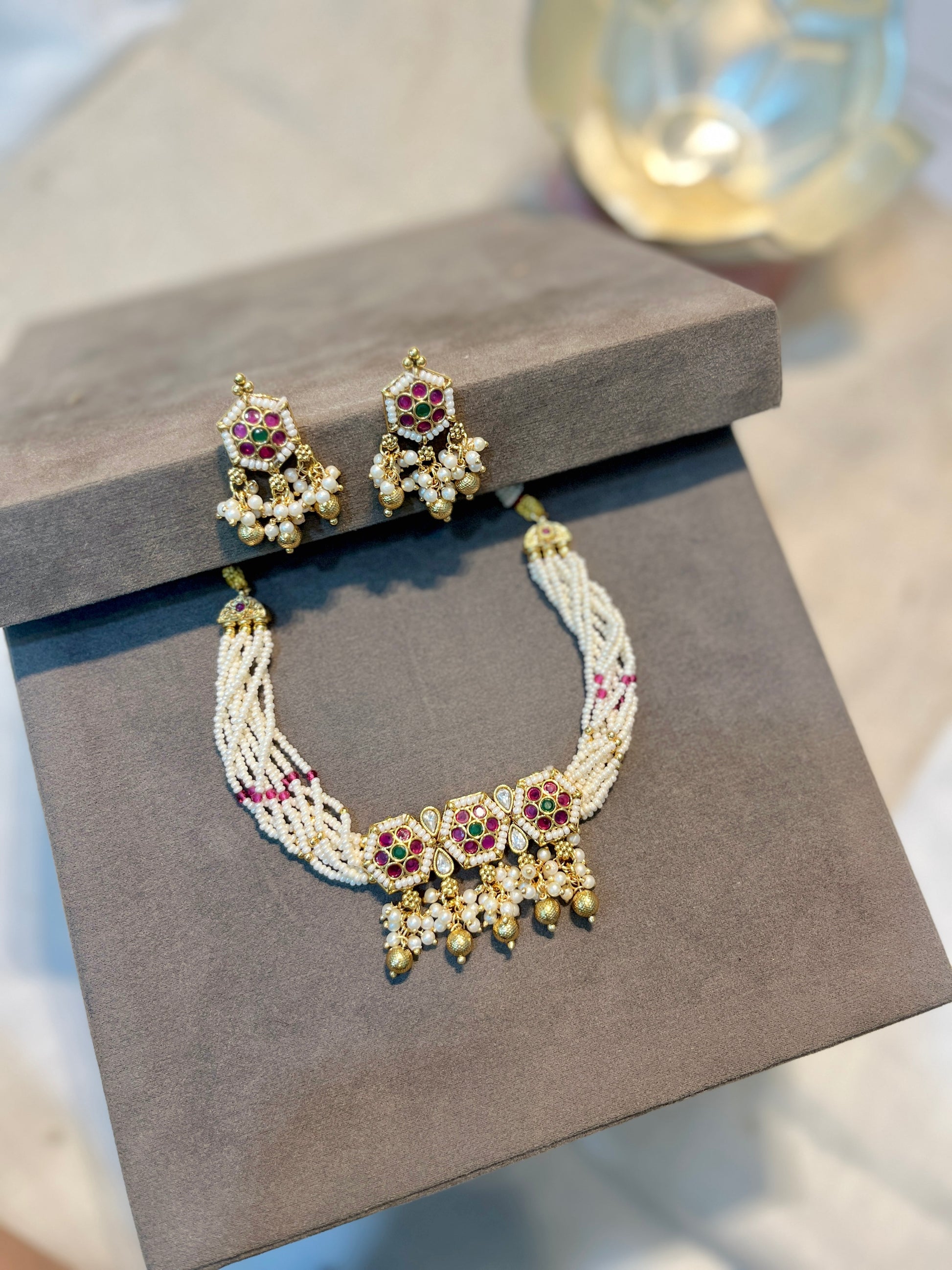 Soft pearl hues meet sparkling stones in this beautifully detailed motif necklace set. Designed with a central floral motif and classic drop earrings, it’s an elegant touch for sangeets, receptions, or refined daily wear.
