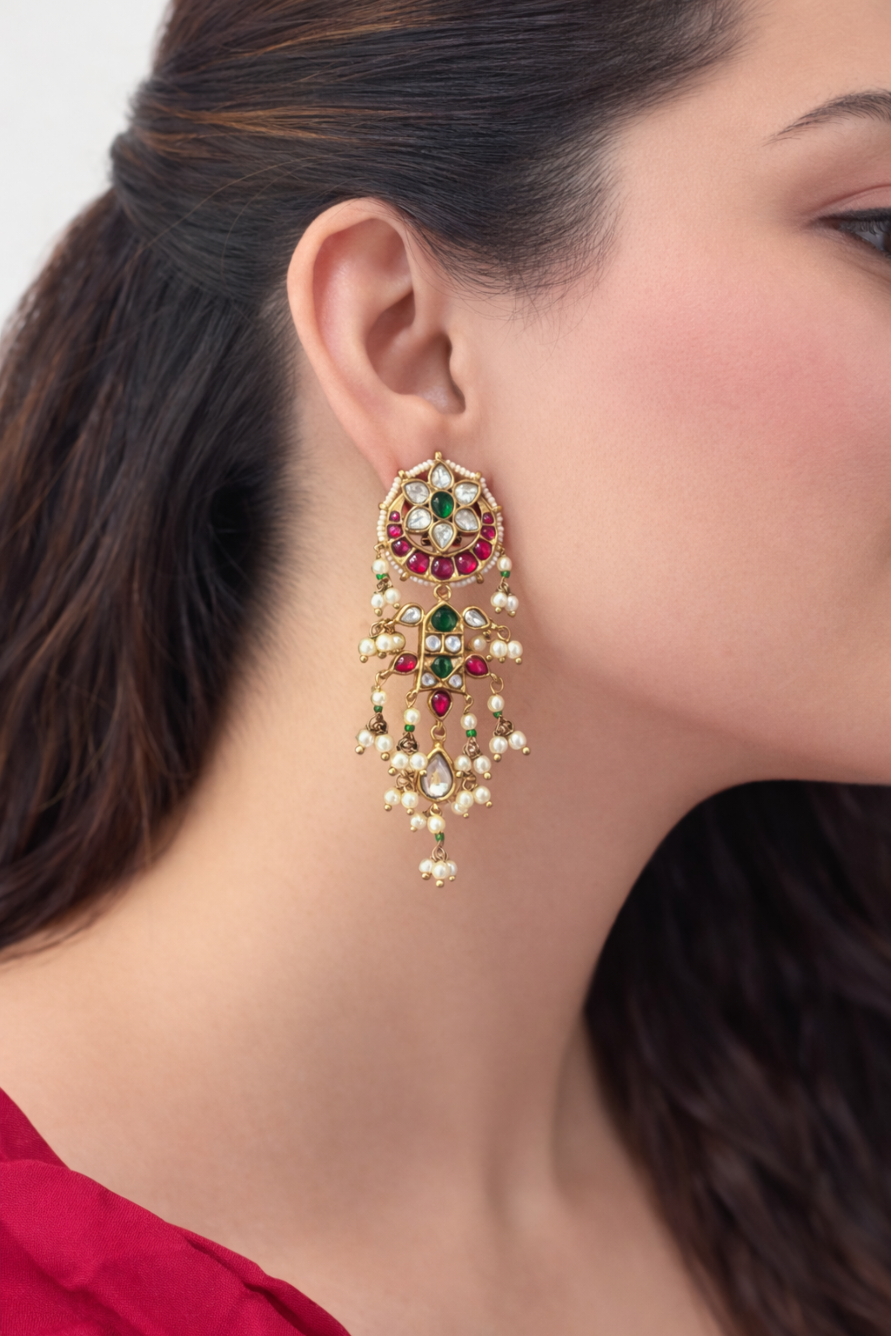 A majestic multi-tier design of Polkis, colored stones, and pearl clusters that sways gracefully - crafted for statement celebrations.