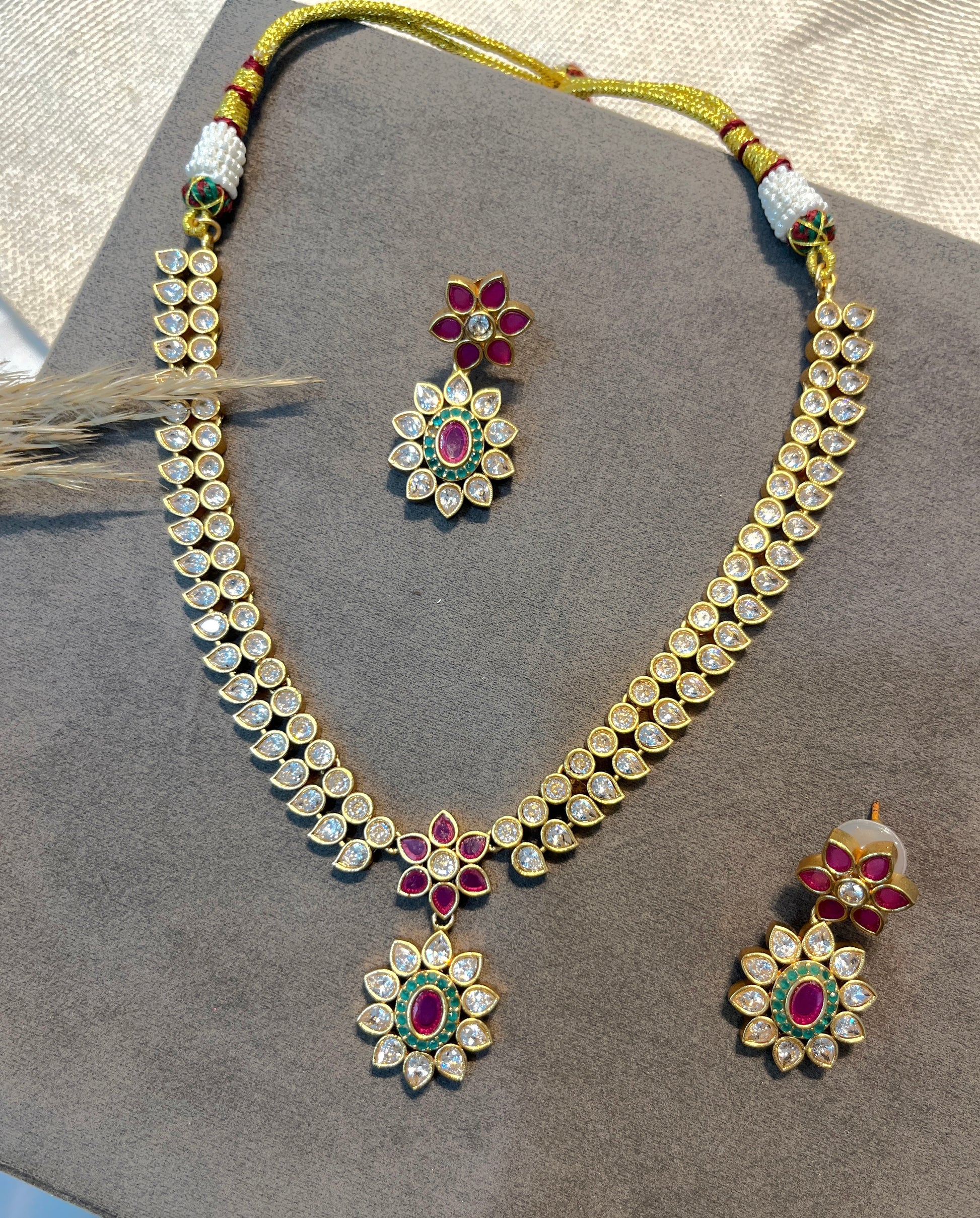 An ode to heritage and divinity, this temple necklace set features intricate motifs and colorful synthetic stones, reflecting South Indian temple artistry. A perfect choice for festive rituals or temple weddings.