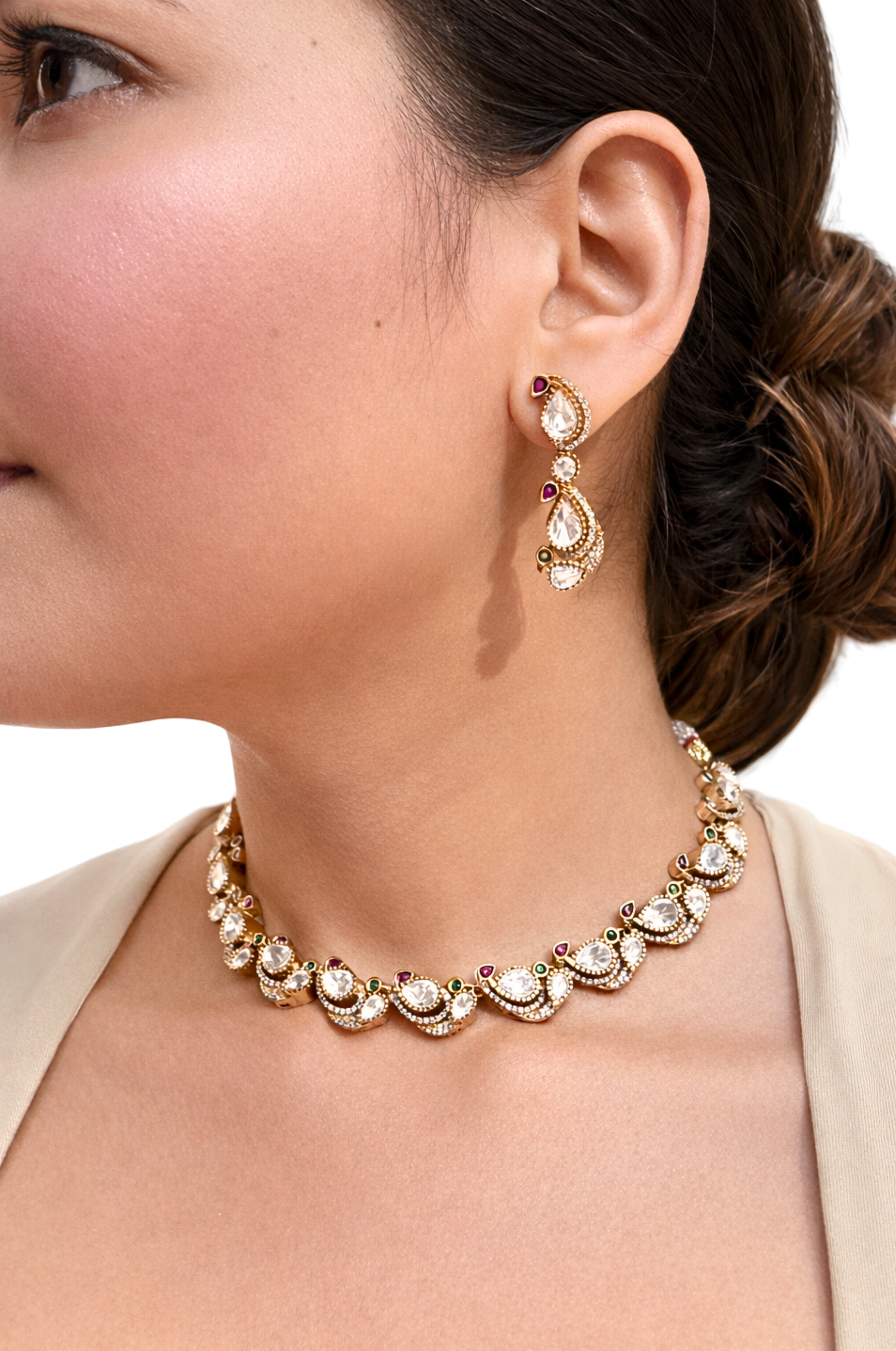 Charmingly quirky, this Gold Finish Textured Peacock Polki Necklace adds a touch of whimsy to any outfit. This unique and classic piece features intricate textured detailing and stunning peacock-inspired polki stones. Feel regal and playful at the same time with this statement necklace.