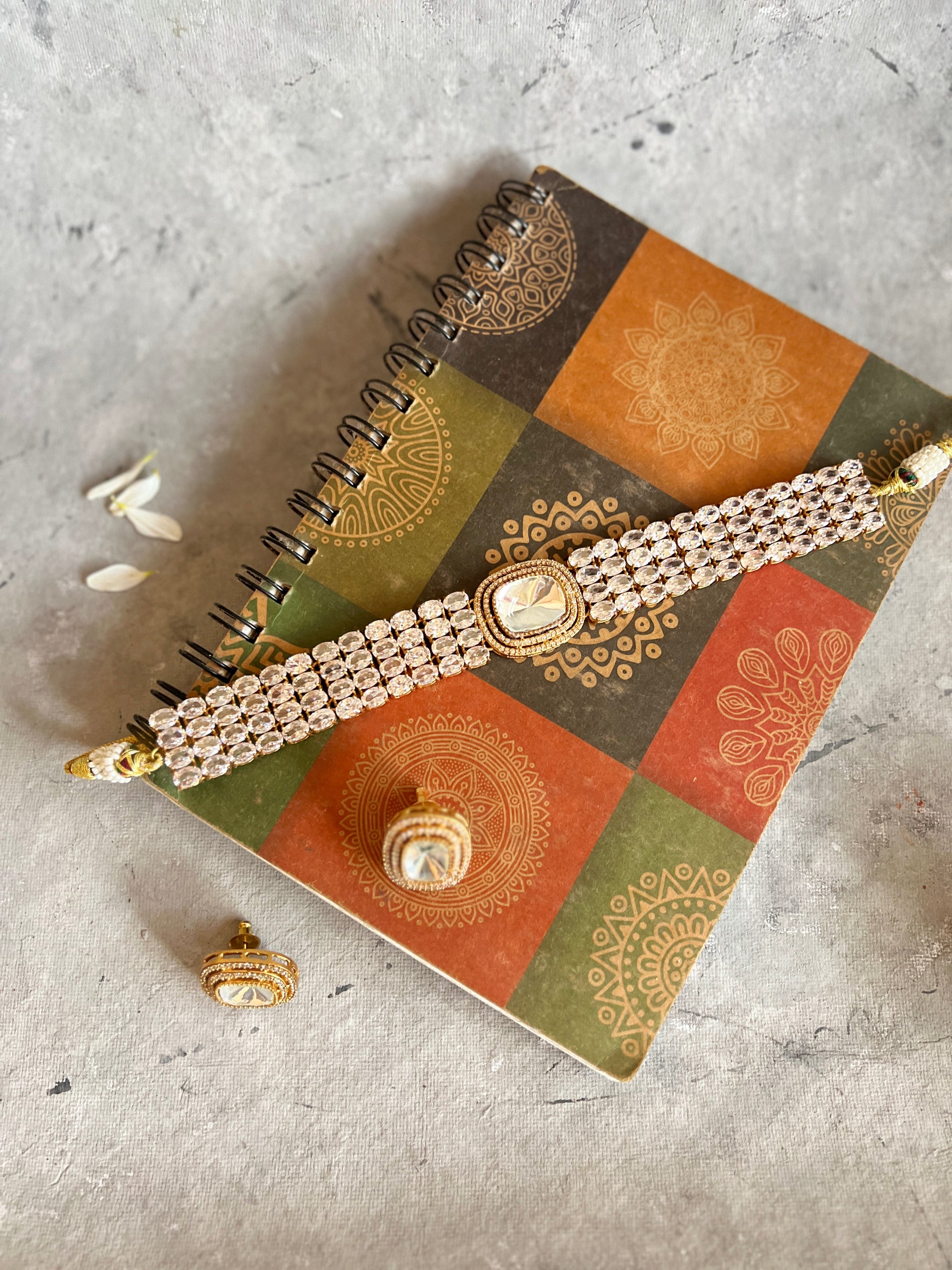 A bold statement of refined artistry, this gold-toned choker set features a striking uncut centerpiece, framed by intricate metalwork and delicate shimmering accents. The choker is designed with multiple rows of brilliant-cut stones, creating a structured yet fluid silhouette that embraces the neck beautifully. Paired with matching earrings that echo the same regal aesthetic, this set blends contemporary elegance with a touch of vintage charm. Perfect for special occasions, it radiates effortless allure and impeccable craftsmanship.